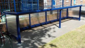 Secondly, while we were designing these buggy shelter and pram shelters SureStart who asked for number of each, were concerned about the security of the buggies. We therefore fitted buggy tether rails that on the buggy shelters run from front to back. By using a simple cycle lock ensuring the buggies remain inside the shelter. Now you will again see looking at other web site how the run along the front. Yes cheaper to make, but how silly, the buggy shelter is then pulled out into the rain!